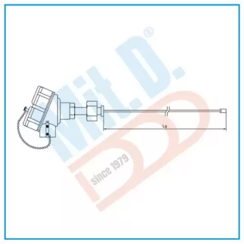 Mineral oxide insulation thermocouple with ATEX head, TXF model, equipped with fixed extension and skin point. Suitable for contact measurement, typically for high temperatures.