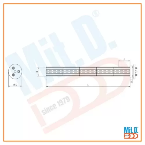 Resistenza per forni industriali, modello SCN. Realizzata con spirali resistive, montate su scanalati ceramici termici. Sono prodotti in grado di raggiungere temperature di lavoro particolarmente elevate (fino ad oltre 1000°C). Costruite su specifica del cliente, sono dotate di perni M6 in uscita.